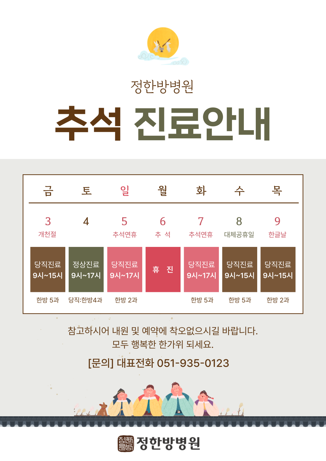 10/4일(토) : 정상진료 (오전 9시 ~ 오후 5시 / 당직: 한방 4과)